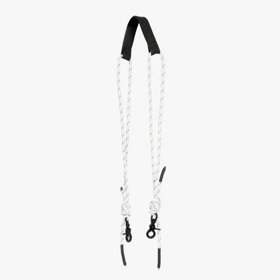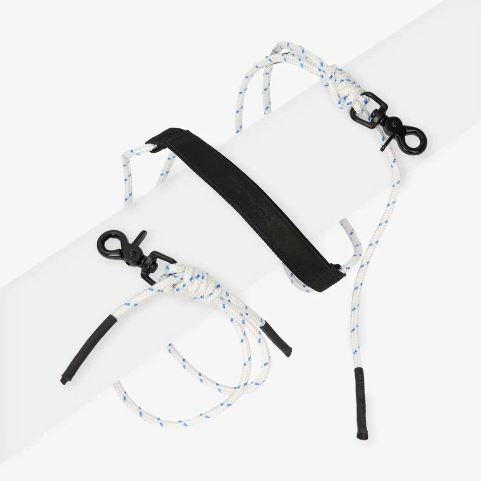 . Крепится на металлических карабинах, основа состоит из стропы и толстого шнура. Регулируется благодаря узлам с обеих сторон. Брендирование — на натуральной коже.