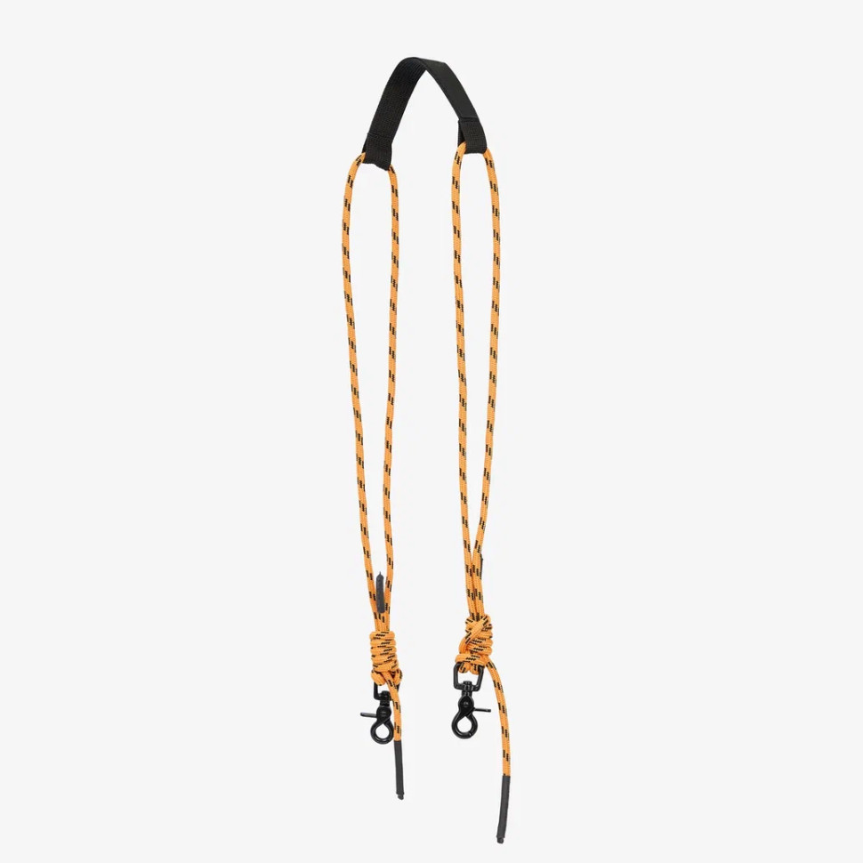 . Крепится на металлических карабинах, основа состоит из стропы и толстого шнура. Регулируется благодаря узлам с обеих сторон. Брендирование — на натуральной коже.